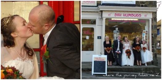 We used a professional photographer that was both fun and willing to take a mix of formal and more informal shots. He certainly kept all our guests entertained with his humour and he took us all for a wander around Masham capturing some very unusual scenes – these are two of my favourite – in the telephone box on the left and outside the Bah Humbugs shop.