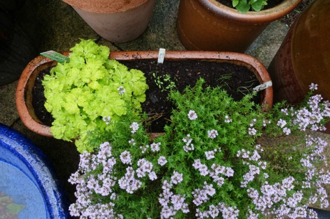 Just before the rain really set in I managed to transplant a few chive and curly parsley seedlings into one of the herb pots to fill the gaps. This one has thyme and feverfew; the thyme has been glorious – I have no idea of the variety but it has flowered all spring.