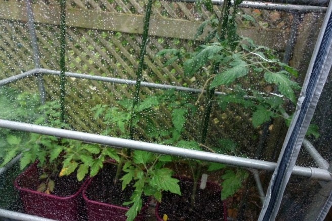 The largest of the tomato plants on the right, Sweet Million an F1 Hybrid, does not have many flowers yet – should I be worried? I think they have been a bit starved of sunshine in our area recently. They have been fed and watered well so I shall just have to wait and see.