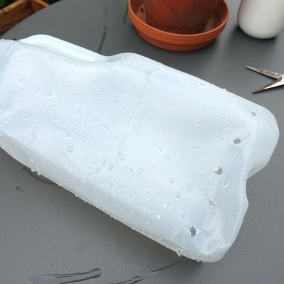 So I came up with this idea and it worked a treat. I used an empty 4 pint milk carton washed out and drilled some holes both in the bottom and low down around the sides. I cut the top off leaving the handle intact – filled the carton with gravel and hosed it down allowing the sandy water to rinse through. Brilliant and I love the bright and zingy splash of orange on the patio.