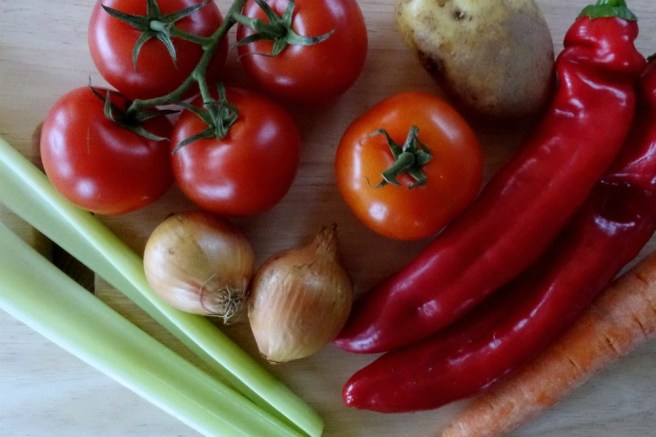 Dissolve the stock cube(s) in the boiling water, add the tomato paste and stir well then add to the pan. Bring to the boil, lower the heat and simmer for about 30 mins stirring occasionally. Throw in a handful of the chopped fresh basil leaves near the end of cooking and add salt and pepper to taste. You can adjust the consistency of the soup at this stage by adding more water if needed.
